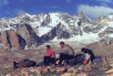 Небо с утра затянуто. За 3 перехода мы подошли к устью Караджилги. Селение с домами осталось на левом берегу у притока, вытекающего из цирка п.5546. Чуть ниже устья Караджилги Торбулунг подпружен и тихо течет по плоскости. Мы переходим на левый берег, перекусываем и идем вверх по Караджилге. Повсюду палатки пастухов. Здесь пасут подростки. Погода понемногу портится. Дует южный ветер. Сыпет попеременно то дождь, то снег. Местность немного заболочена. За 2 перехода доходим до конца зеленки и начинаем подъем к моренам основного ледника этой долины. Обедаем и ставим палатки. Дальше, только камни и снег. Идти нет особого смысла. Высота - 4715. Вечером в 21.00 начинает идти снег. Уже к полуночи его выпало 30 см. Пару раз отряхиваем палатки и отбрасываем снег лопатой.