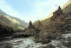 Из-за сильного дождя выход перенесен на час. Выходим в 09.10. Продолжает накрапывать мелкий дождь. С этого склона долины нам удалось разглядеть изливающийся с грохотом 50 метровый водопад в устьевом каньоне реки Торбулунг. За 2 перехода мы подходим к нашей заброске и месту брода. Заброска цела. Второй брод через Кенгшибер-Су прошел без проблем. Вода, похоже, чуть выше (на 510 см). Более серьезной оказался брод через прозрачную ИгебельСу. Однако, мы переправлялись рано, и, струя никого не сбивала. После бродов выглянуло солнышко. Мы устроились обедать и разбирать заброску. Налетевший заряд непогоды испортил нам чаепитие. В 16.20 мы вышли. Тропа подымается сначала по осыпям, а затем по скалам вдоль следующего после Игебельсу правого притока Кенгшиберсу и начинает идти высоко над дном долины. Подъем занял 40 минут. Тропа проходит среди выходов скал и, пересекая пару распадков через 1 переход пересекает правый приток уже Игебельсу. Здесь мы останавливаемся. Рядом пара киргиз гонит стадо черных овец. Налетает заряд непогоды, потом опять светит солнце.
