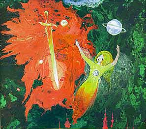 бриллиантом в левой руке и золотым мечом -- в правой, стояла на