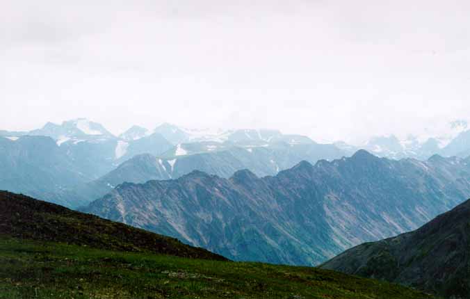Все наши муки оправдал открывающийся с перевала вид на горный массив с пиком Топографов во главе. Уже ради этого стоит ехать в Саяны. Мы ввели единицу красоты - один Саян. Вид на пик Топографов с перевала и стали считать эталоном одного Саяна. Надо сказать, что все последующие красоты редко достигали величины одного Саяна.