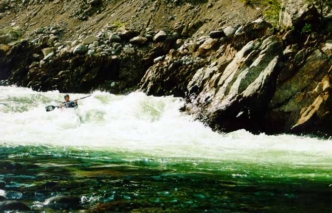 "Бегемот" оказался совершенно неинтересным порогом. Скала посередине реки спокойно проходится справа, после чего очевидный левый поворот и никаких проблем. Ни прижимов, ни бочек. Правда, я умудрился там залечь. Пройдя порог, я смотрел по сторонам (точнее вперед и назад), сплавляясь лагом, весло лежало поперек каяка. В таком положении я заехал на границу улова и тут же полег. Я только успел схватить весло и начать материться по поводу глупого киля. Тут же встал с полным носом (своим, а не каяка) воды (не ожидая такого расклада, зажим я не одевал).