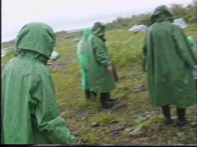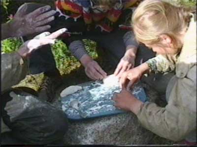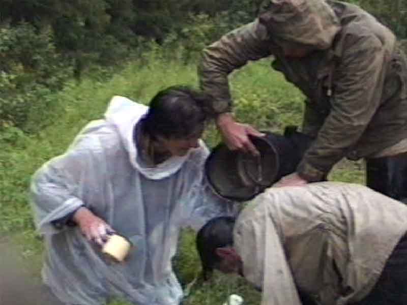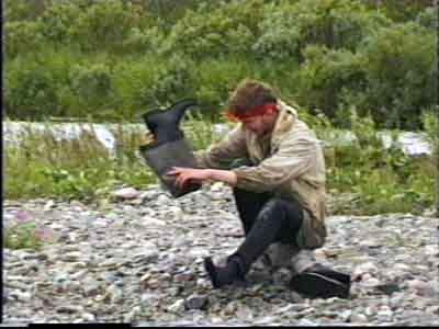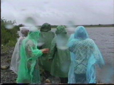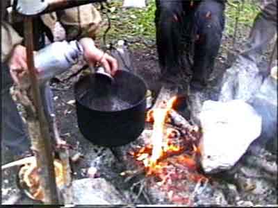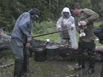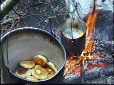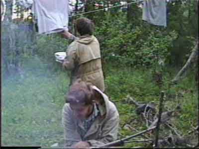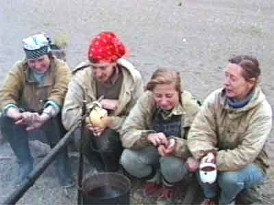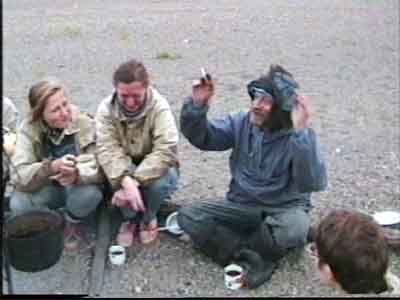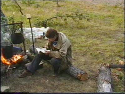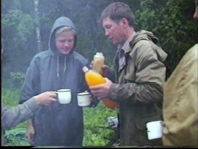 берегу в травке. Дежурят Коля с Олей, на ужин пюре и халва. Очень холодно, все довольно