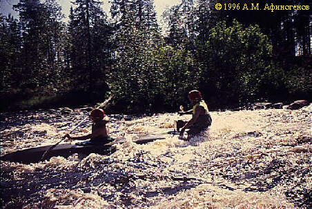 Порог No47 (IIб, 350 м). Первая часть -- шивера длиной около 100 м. Сходу. Дальше лучше осмотреть по левому берегу. Слив в середине порога и довольно мощная шивера (250 м). Сразу --