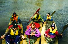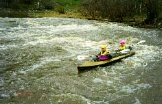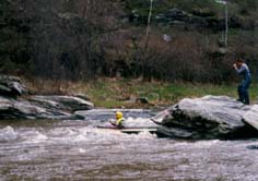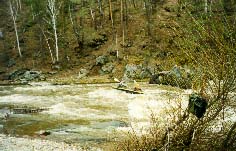 Обязательная разведка и страховка, особенно 3 и 4 ступеней. Первая и вторая ступени проходятся у левого берега. После прохождения слива 2 ступени резкий уход вправо от камней. Главный слив третьей ступени более безопасно проходится у левого берега с резким траверсом к правому берегу. Возможно прохождение главного слива 3 ступени и у правого берега, но в этом случае надо очень точно войти в поток, иначе неизбежно опрокидывание байдарки или уход ее под скалу справа. Шивера после главного слива 3 ступени проходится в центре русла. Страховка 1-3 ступеней с левого берега. Вход в 4 ступень в центре русла, прохождение больших камней -- у правого берега, далее -- в центре русла, выход из шиверы -- ближе к правому берегу. Страховка с правого берега. |